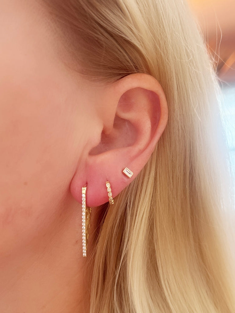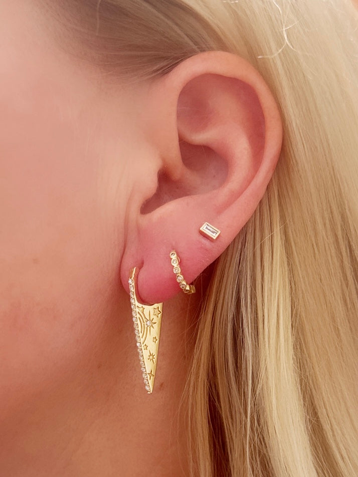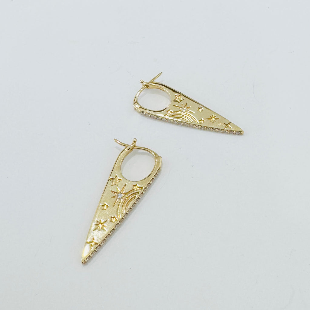 14 k gold large spike huggies with engraved starry night theme on sides with pave diamond edge, 12 mm exterior, (38) 0.43 FCW, 6.36 YG, 12x33 mm