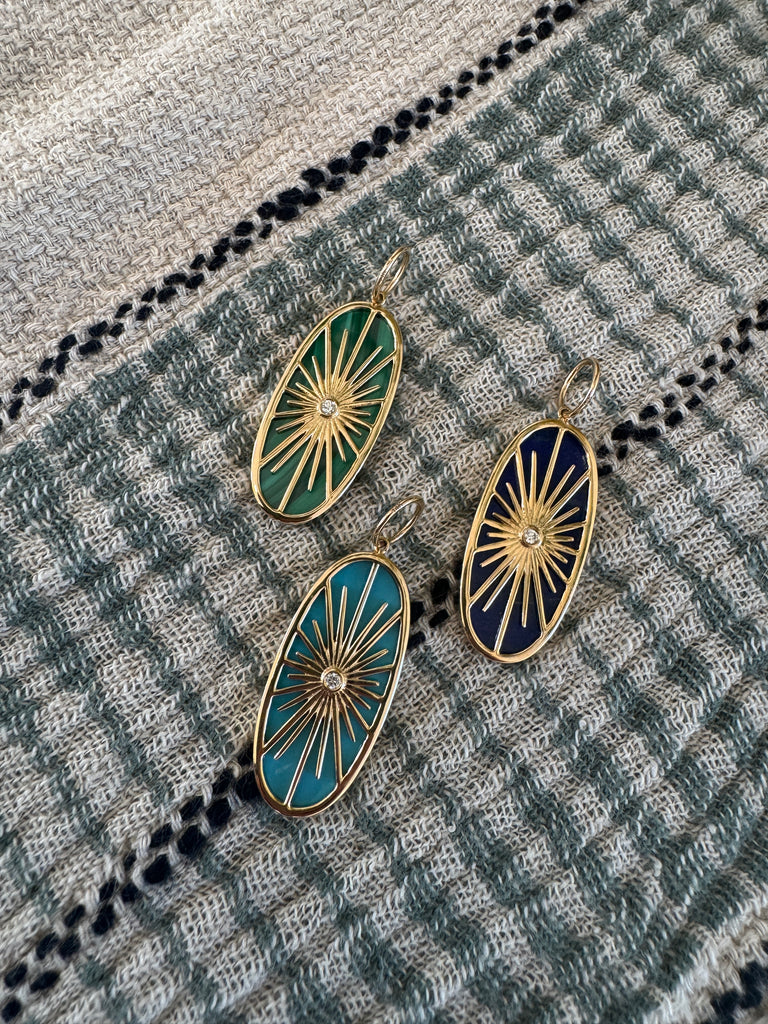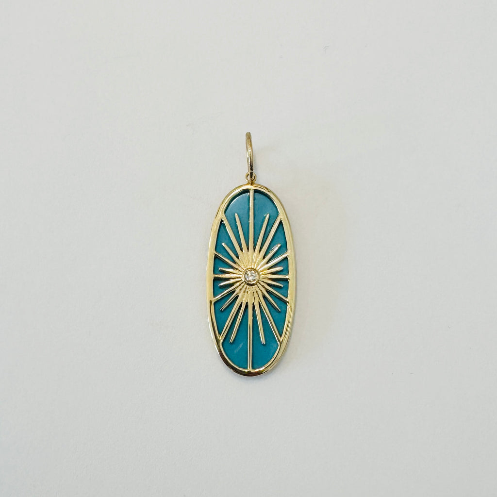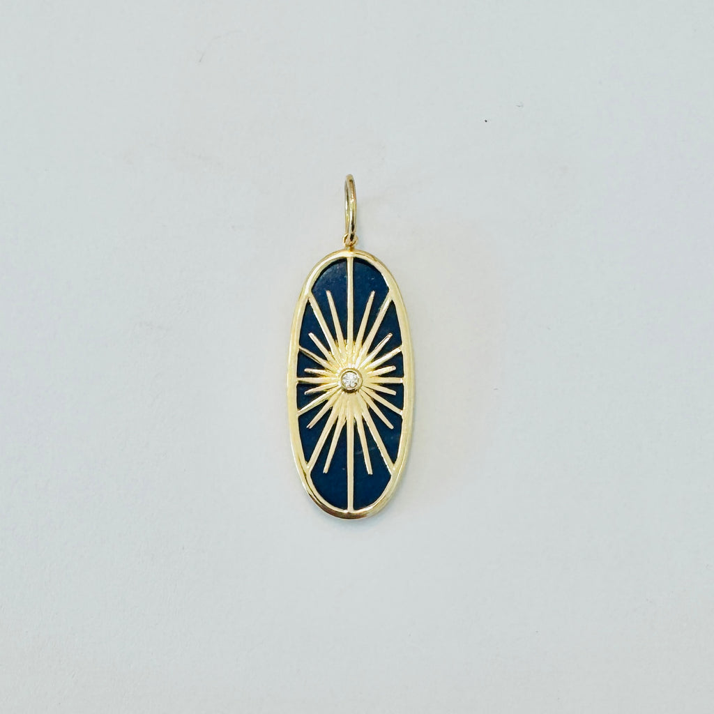 14 kt gold bezel set malachite oval with gold starburst and 14 kt gold and diamond hinged bail, 1.5 inch in length with bail, 1.75 inches