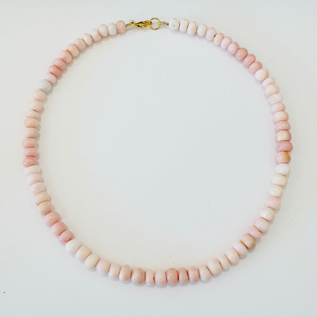 smooth pink opal candy necklace with gold filled clasp, 17 inches in length