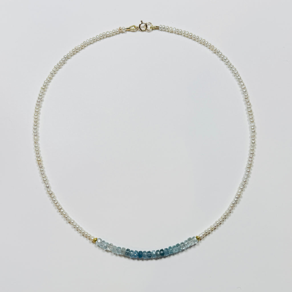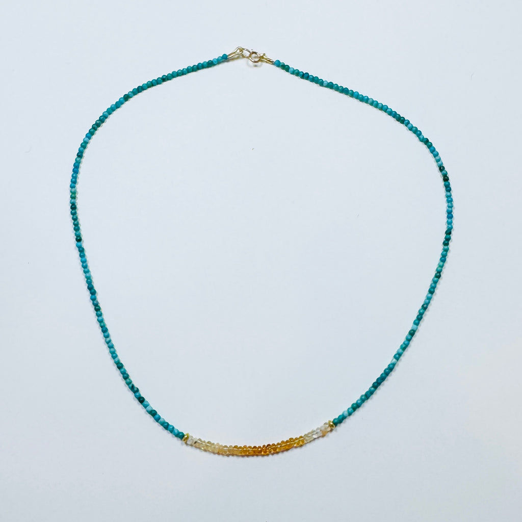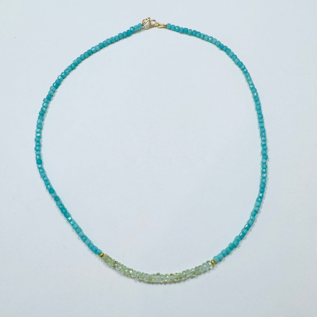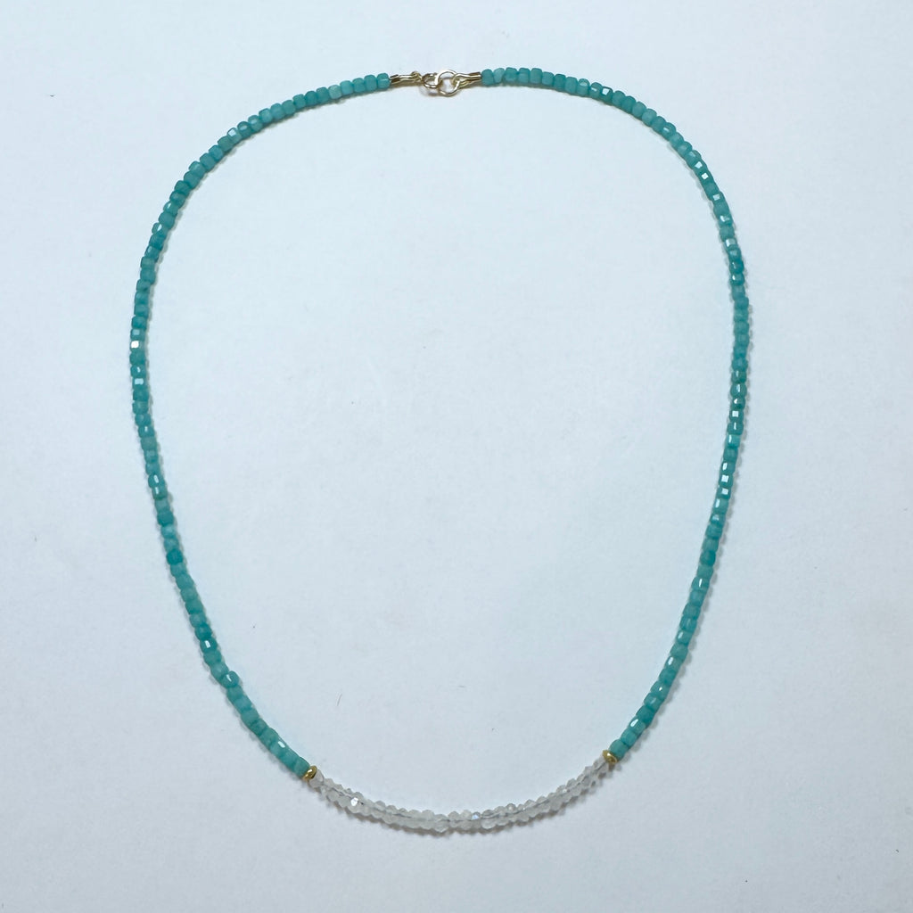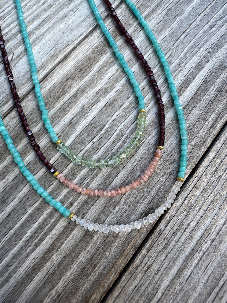 Delicate color blocked gemstone necklace with two 14 kt yellow gold wheel beads and clasp, 15 inches in finished length